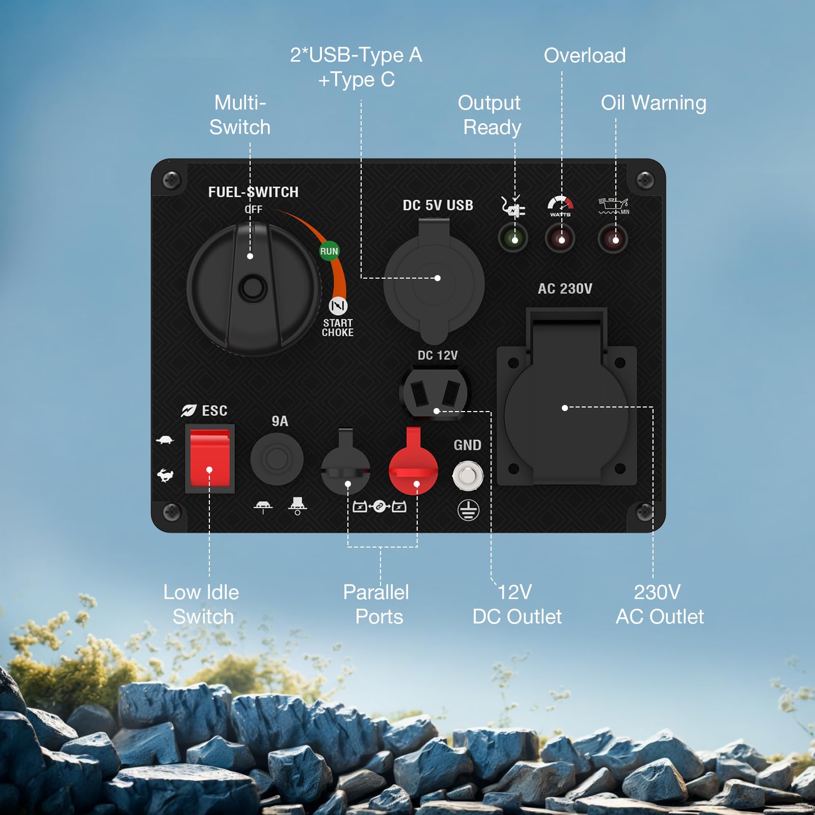 - Unique Feature and Multifunction Control Panel - The outstanding design features bright orange appearance and a multifunctional panel including parallel outlets, a standard 230v 3 pin socket, 2 USB charging ports(type-A & type-C), a 12v DC charging outlet. It's convenient to double or even triple your power by using the parallel kit to connect to another AIVOLT inverter generator (including 1.2KW, 1.8KW, 3.3KW).